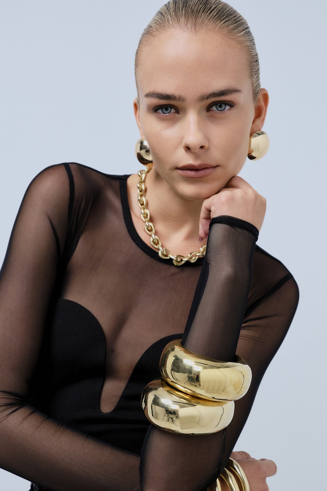 The Elle Bodysuit combines a semi-stretch sculpting crepe body with a soft mesh overlay for a sleek, refined finish. A sweetheart bust detail completes the look with understated femininity.
