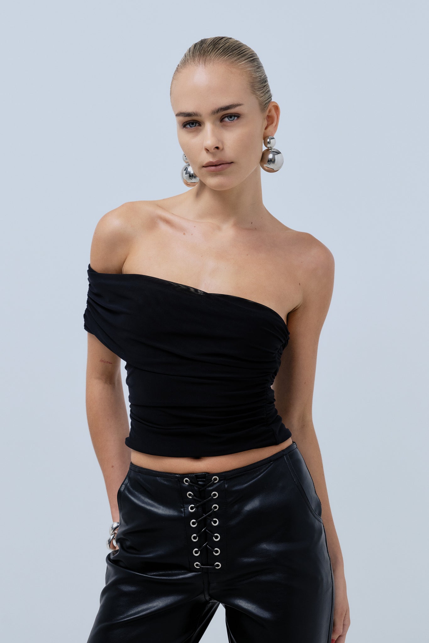 The Muse Top features a sheer mesh overlay with subtle ruching over a smooth, stretchy lining. Designed to flatter the silhouette while remaining comfortable and refined for any occasion.