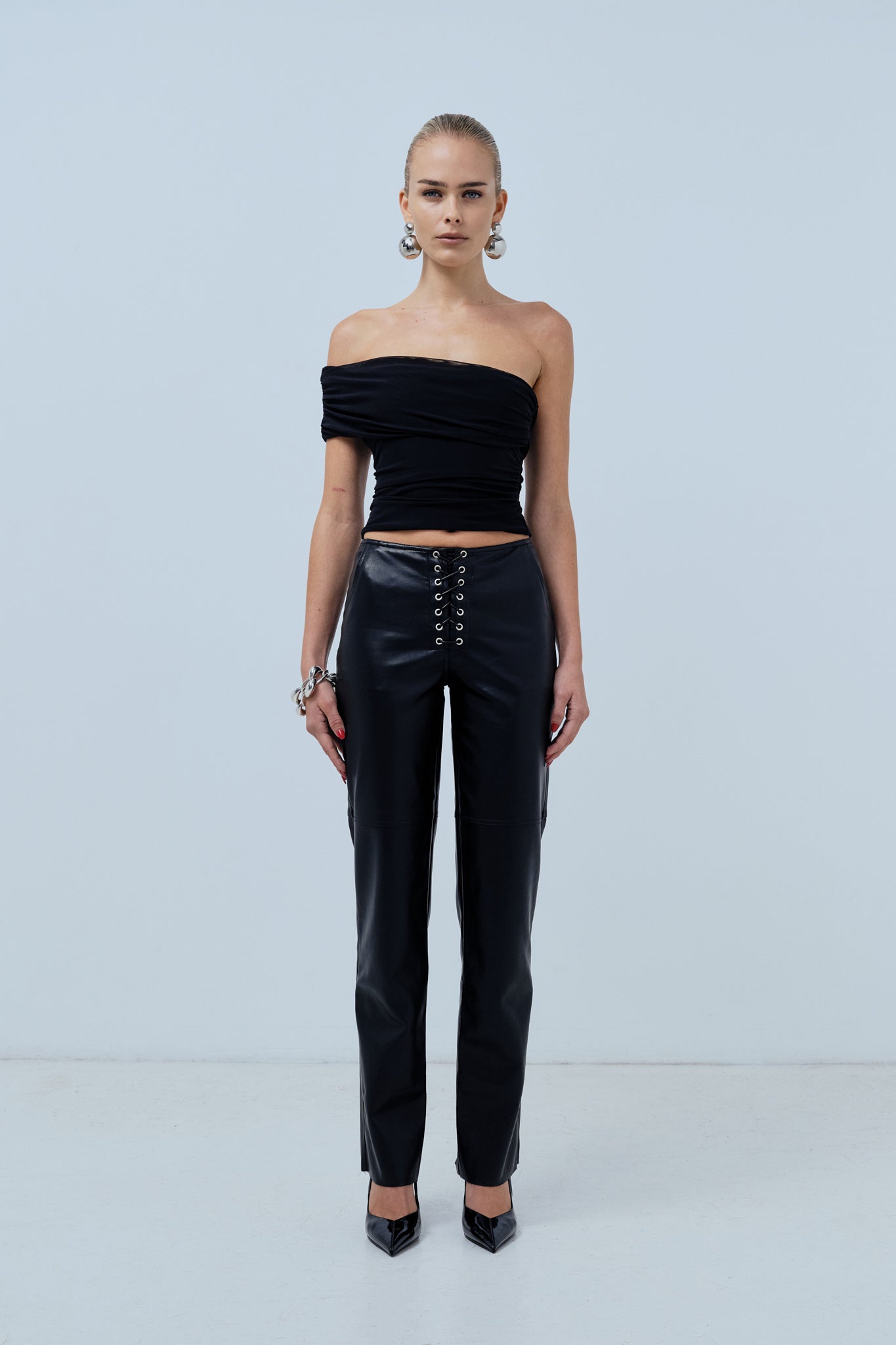 An off-shoulder top that combines understated elegance with a feminine edge.